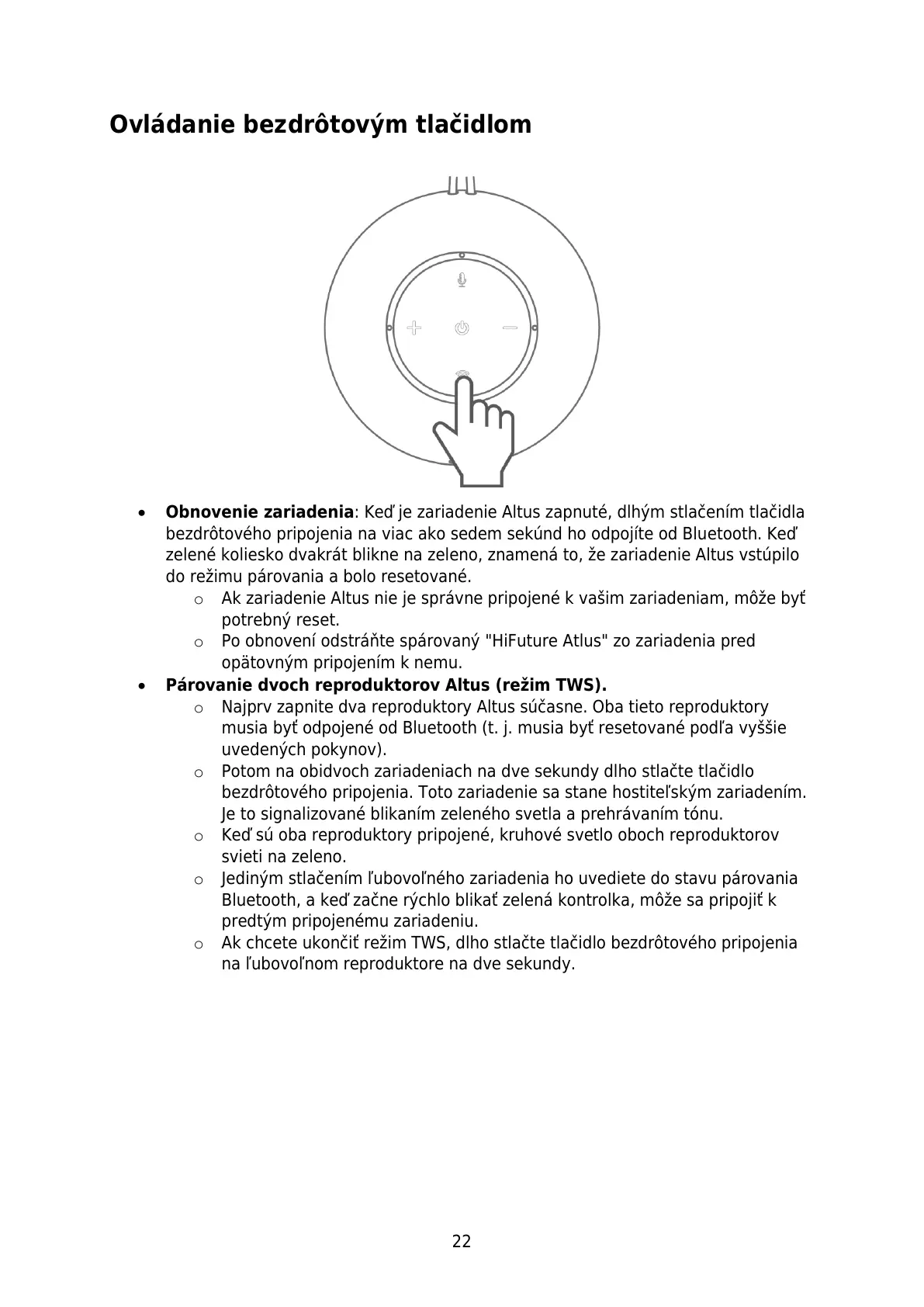 o Ak chcete ukončiť režim TWS, dlho stlačte tlačidlo bezdrôtového pripojenia