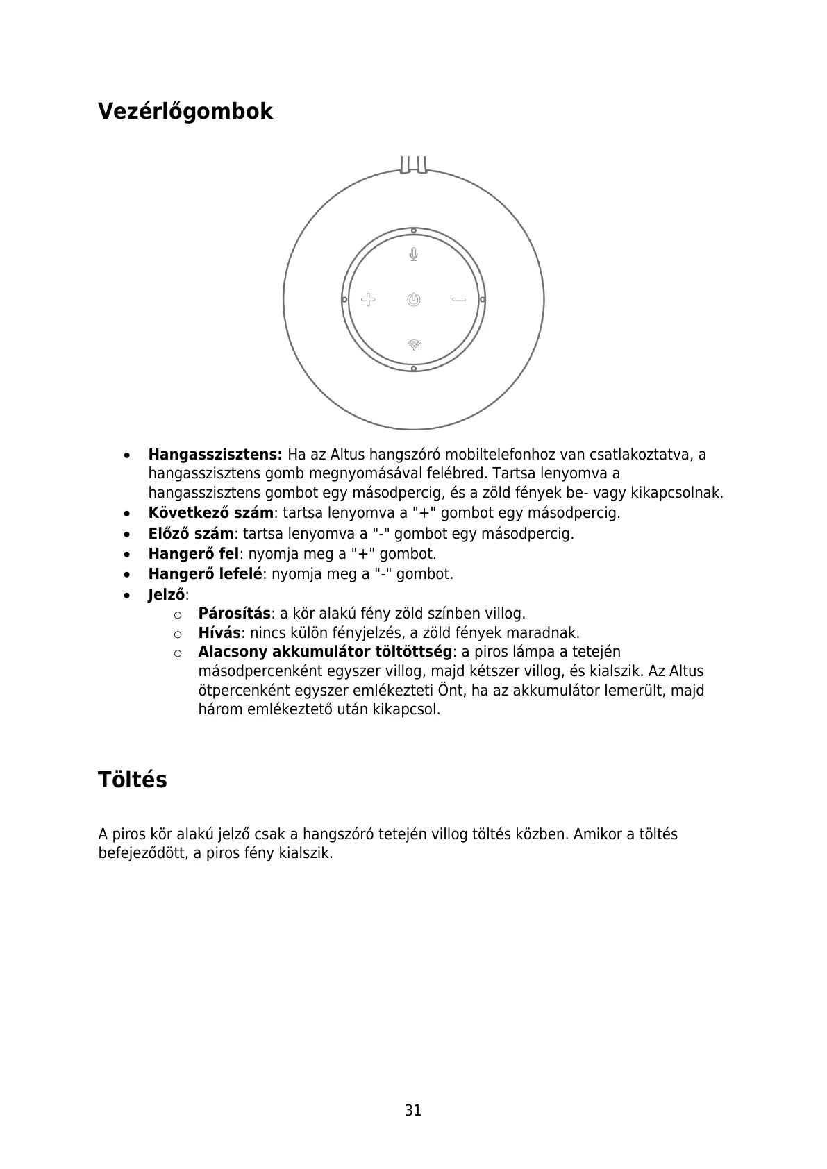 A piros kör alakú jelző csak a hangszóró tetején villog töltés közben. Amikor a töltés