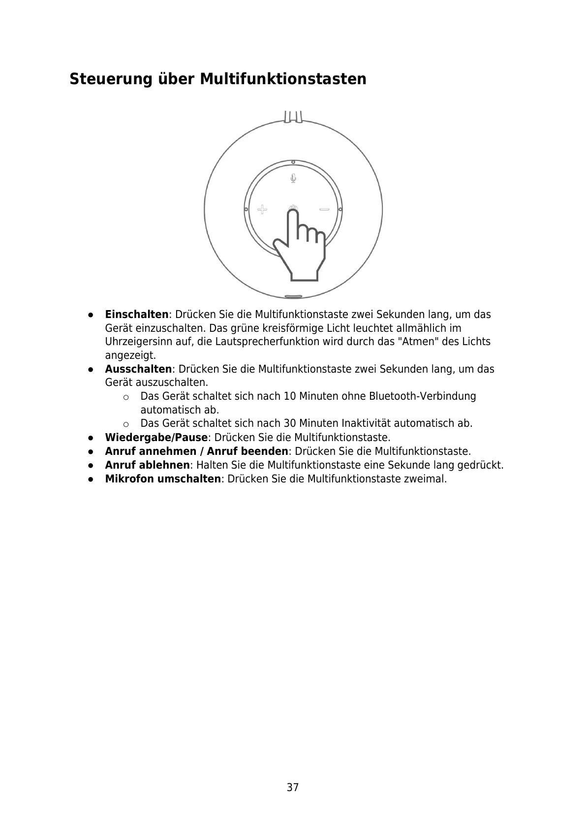 ● Ausschalten: Drücken Sie die Multifunktionstaste zwei Sekunden lang, um das