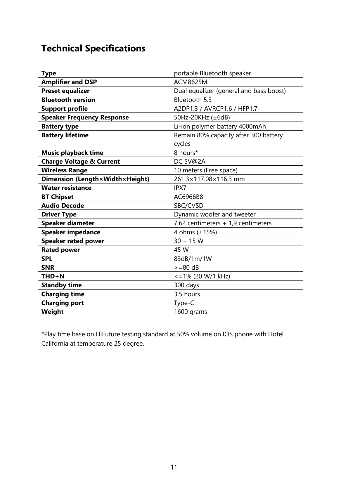 *Play time base on HiFuture testing standard at 50% volume on IOS phone with Hotel