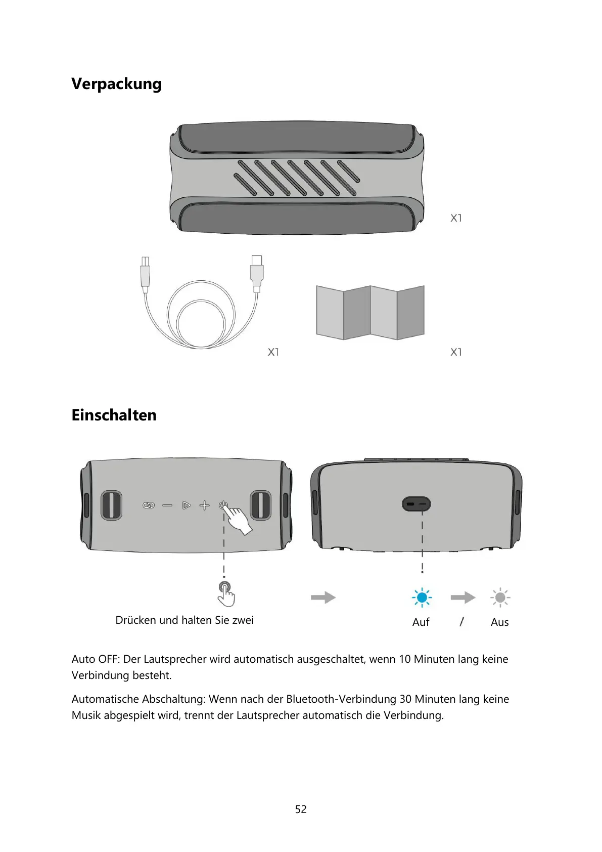 Auto OFF: Der Lautsprecher wird automatisch ausgeschaltet, wenn 10 Minuten lang keine
