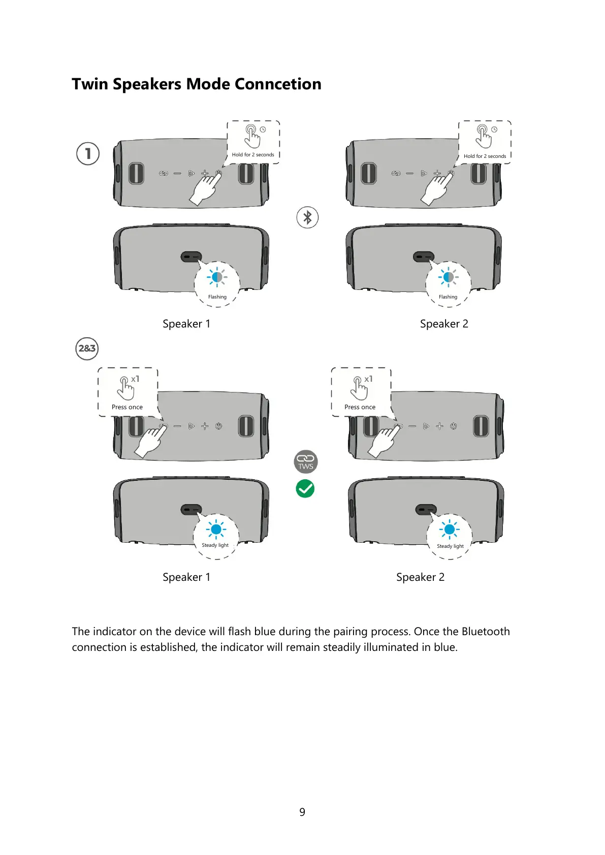 The indicator on the device will flash blue during the pairing process. Once the Bluetooth