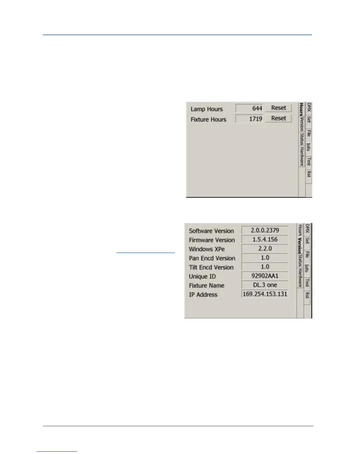 sensor status, total fixture and lamp hours, and DMX errors. You can also reset Lamp and