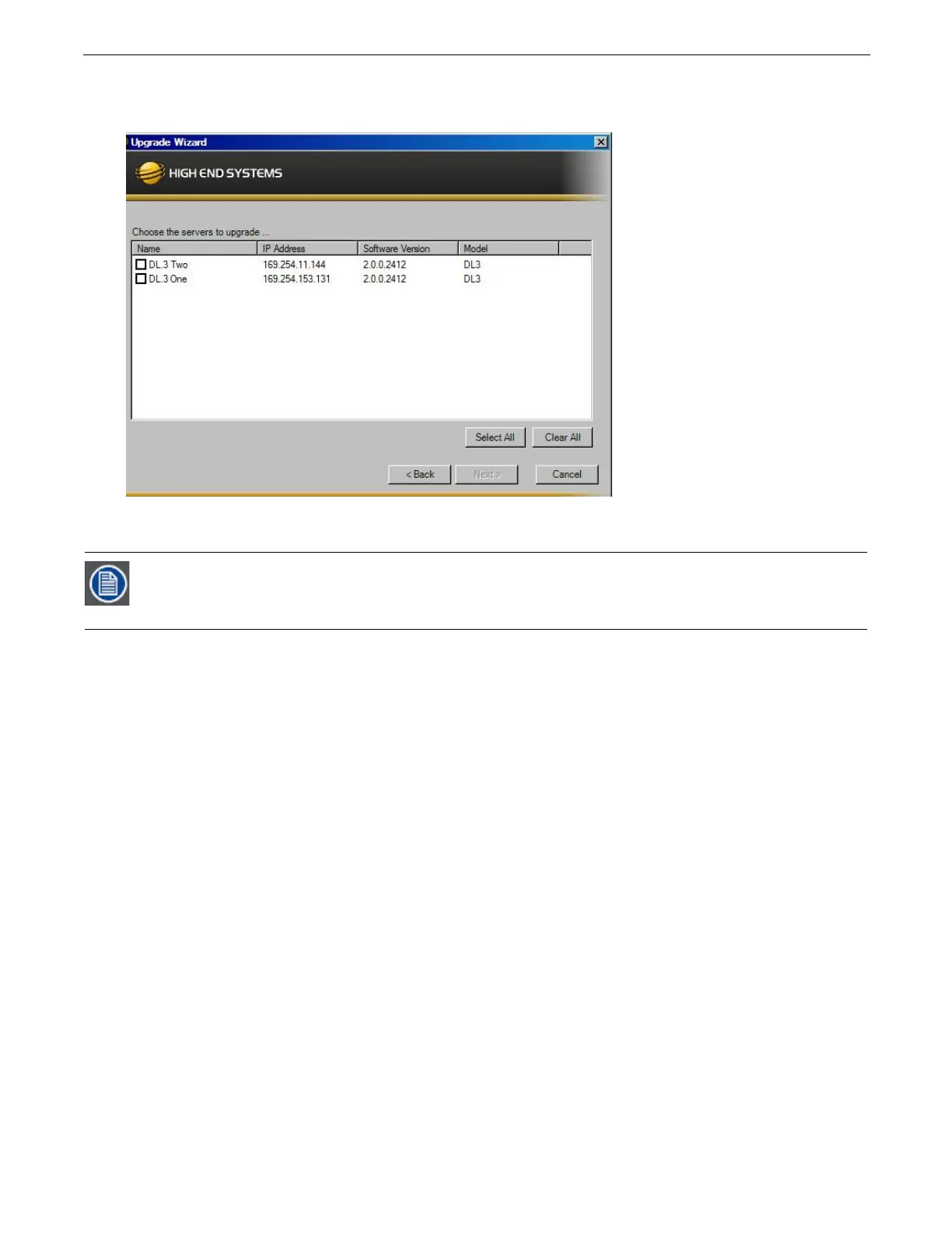 5. After locating the upgrade file, press Next. The Upgrade Wizard displays a list of all servers connected to the fixture network.