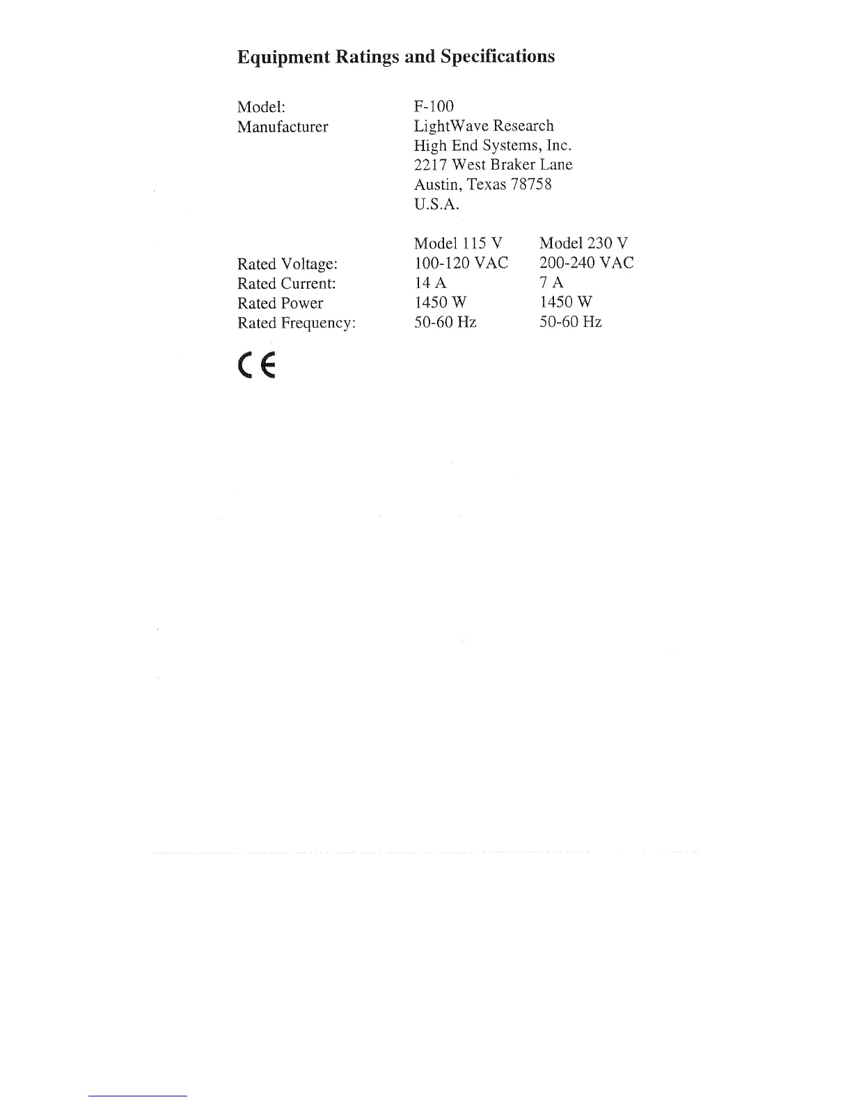 High End Systems F-100 - Equipment Ratings and Specifications; Electrical Specifications