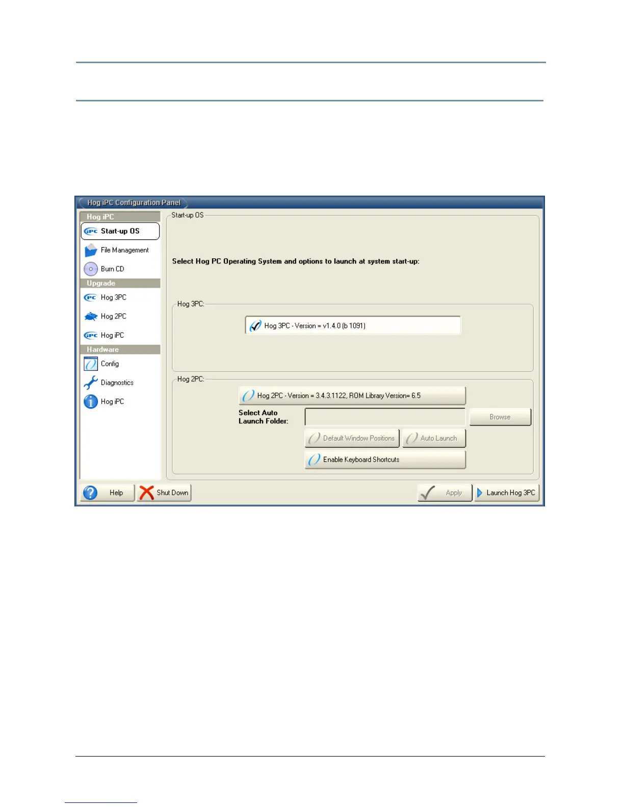 Selecting Start-up OS displays a screen with two sections labeled: Hog 3PC and Hog 2PC.