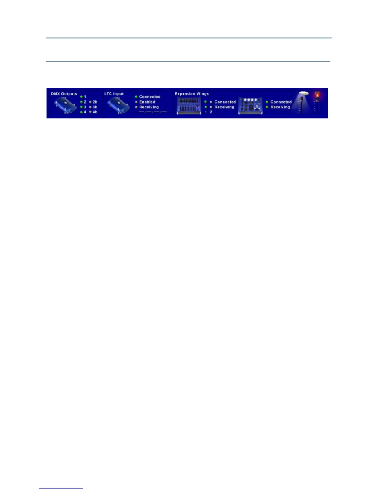 The seven indicators show the state of the seven supported universes of DMX output. Grey
