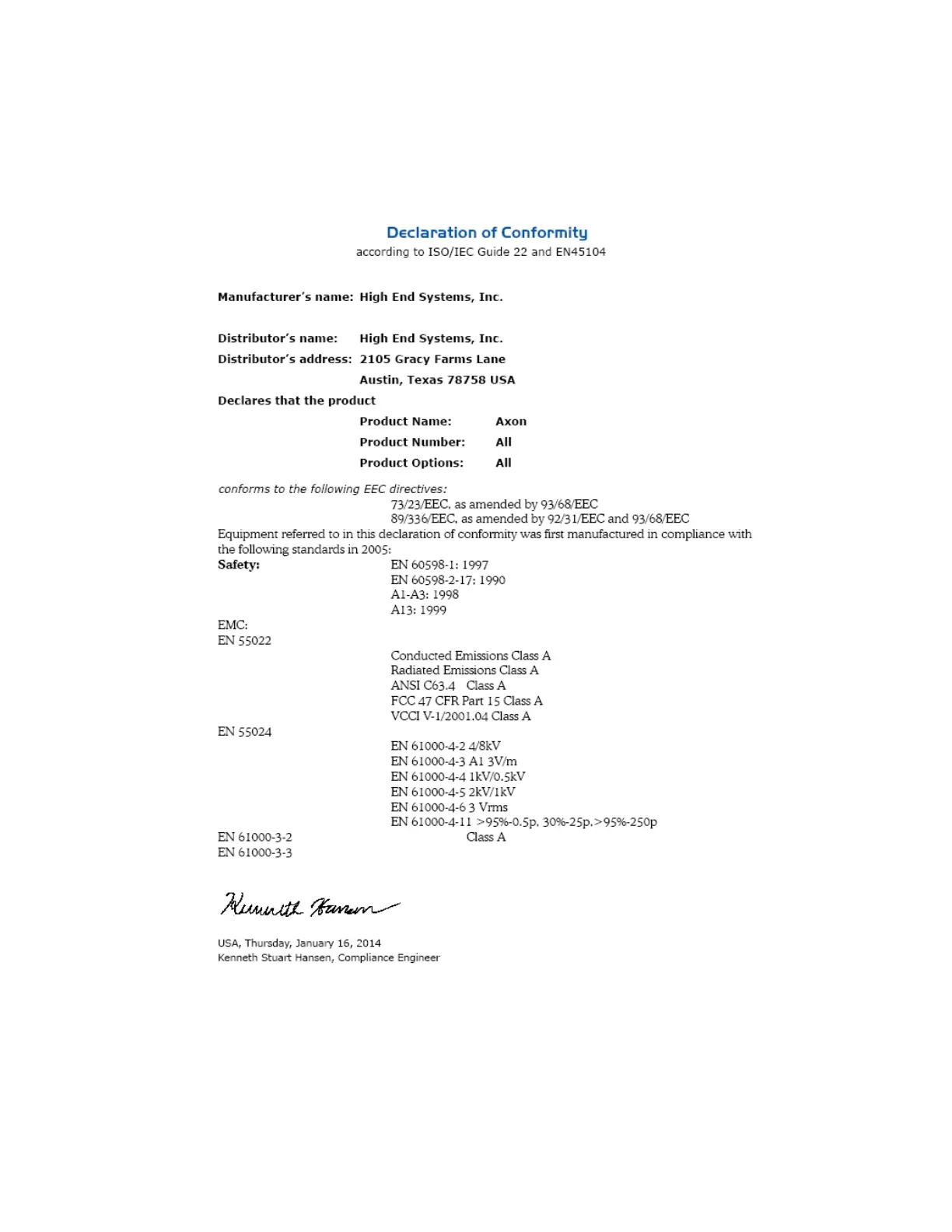 High End Systems MMS100 - Declaration of Conformity