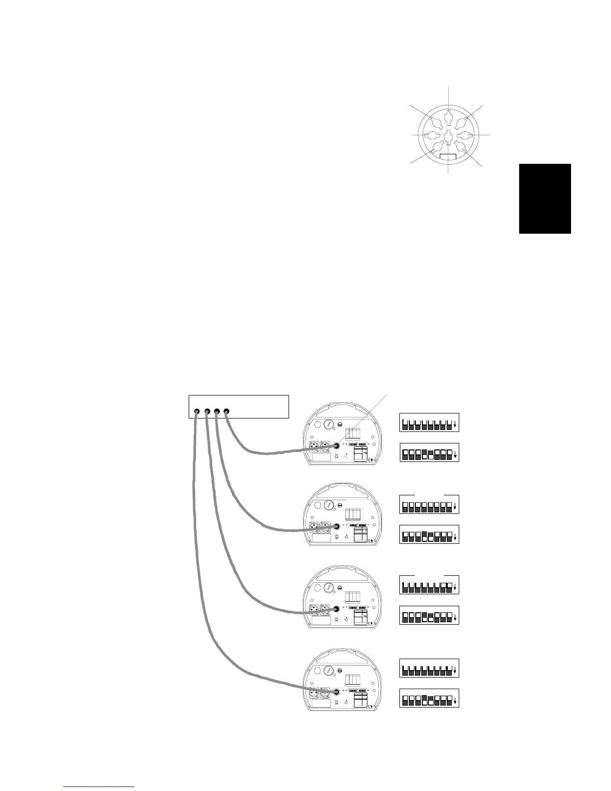 1. On all fixtures, set personality switches 4 and 5 ON and set all