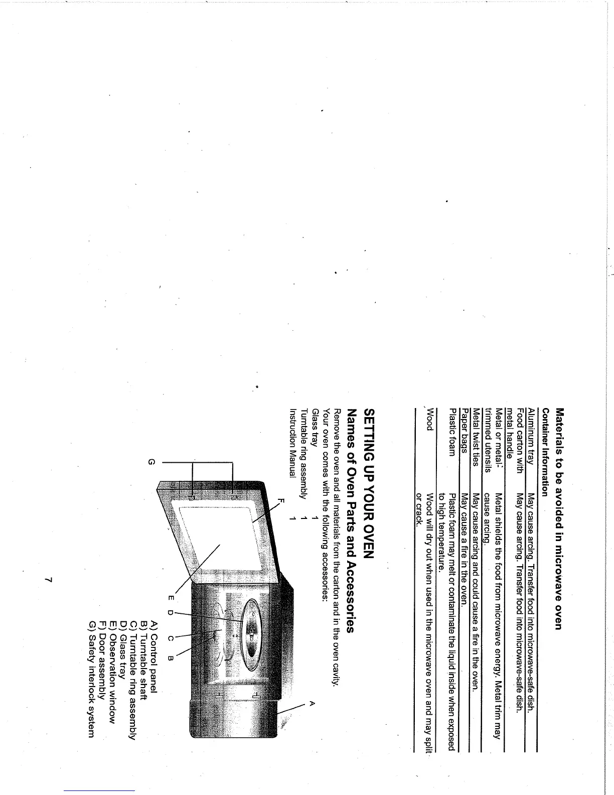 high pointe EM925BSC - Materials to be avoided in microwave oven; Setting Up Your Oven; Names of Oven Parts and Accessories