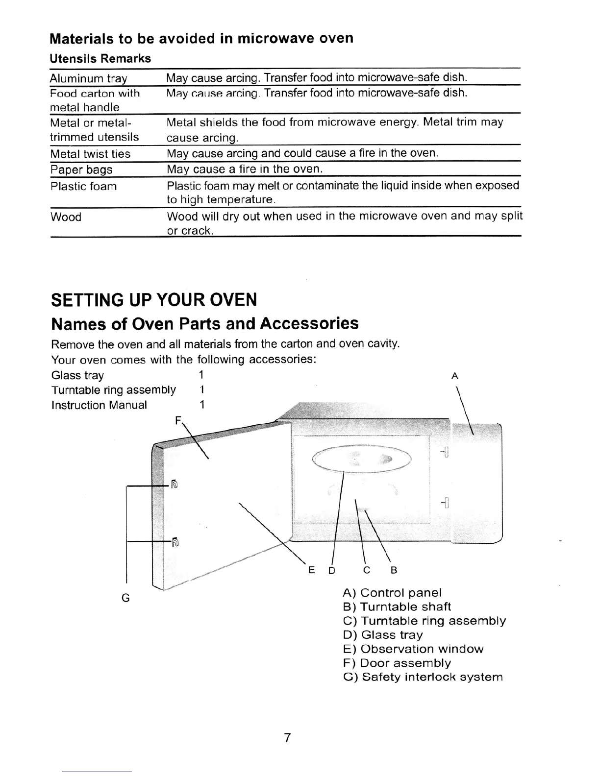 high pointe EM925RSL-B - Unsafe Microwave Utensils; Setting Up Your Oven; Oven Parts and Accessories