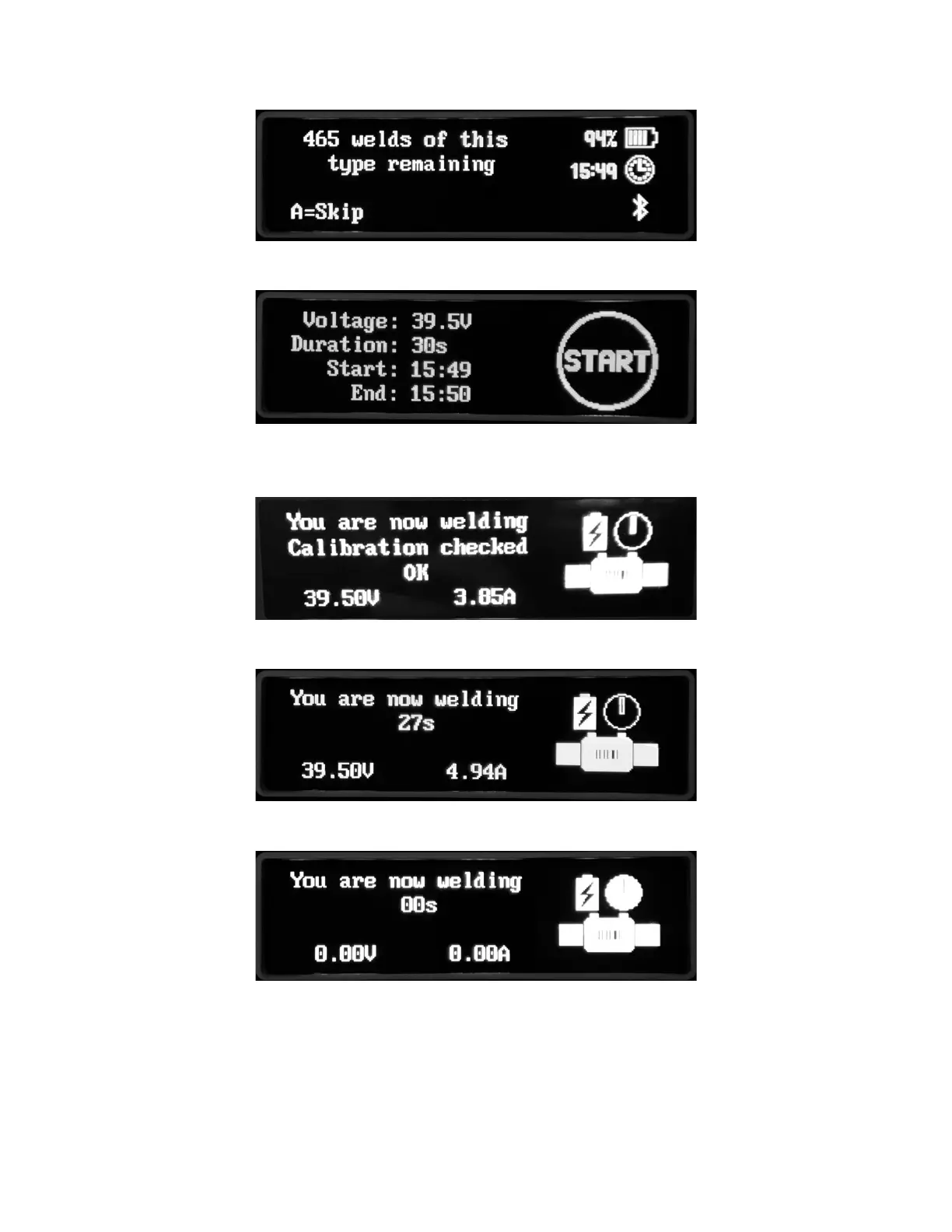 As fusion progresses, the welding voltage and current are shown.