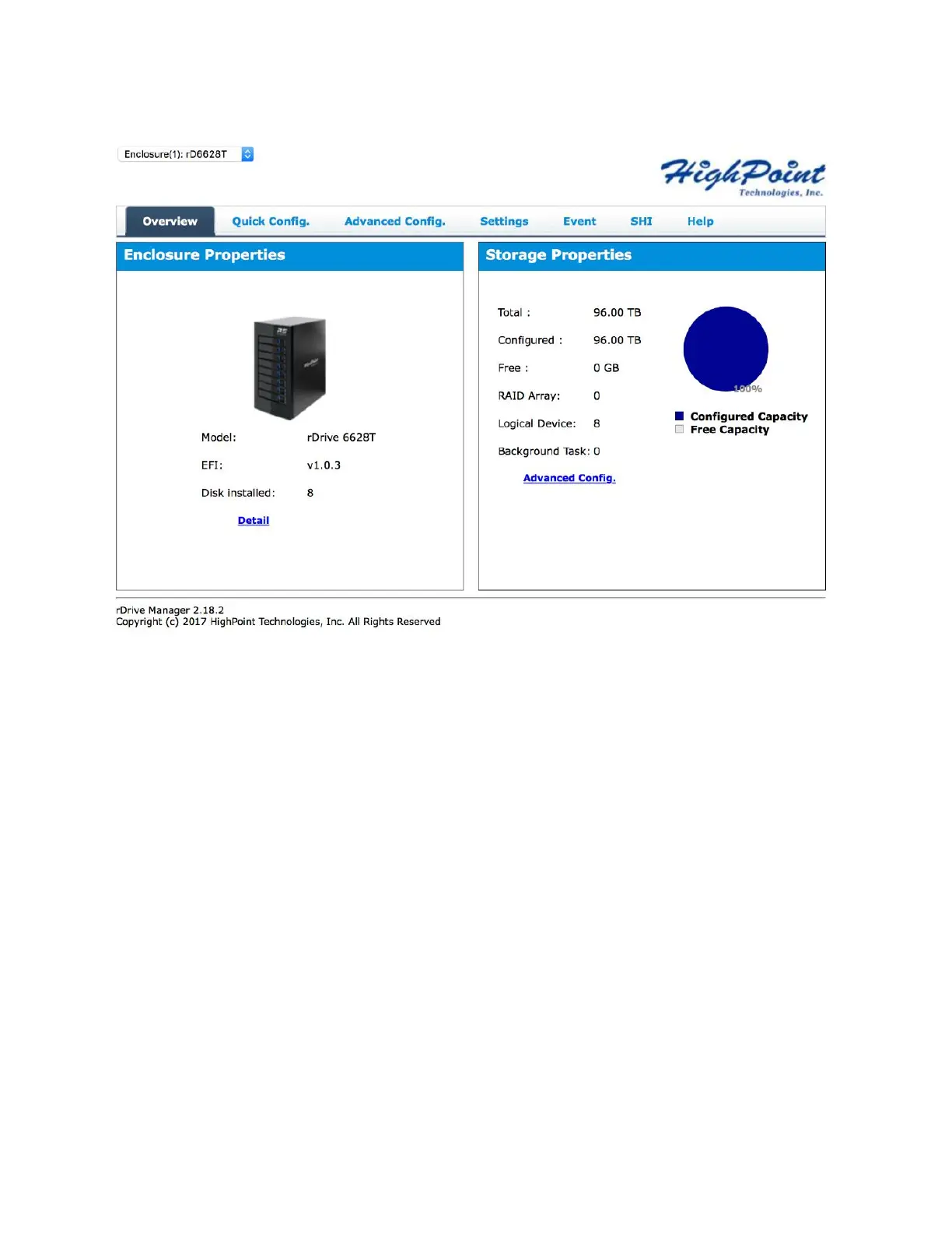 The Overview provides information regarding each HighPoint Enclosure connected to your computer