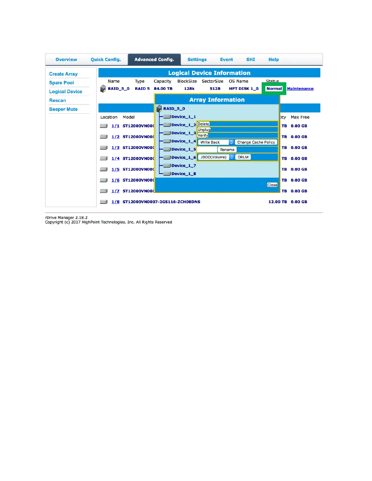 Arrays with the Normal status are healthy and functioning properly. Arrays with the Normal status will