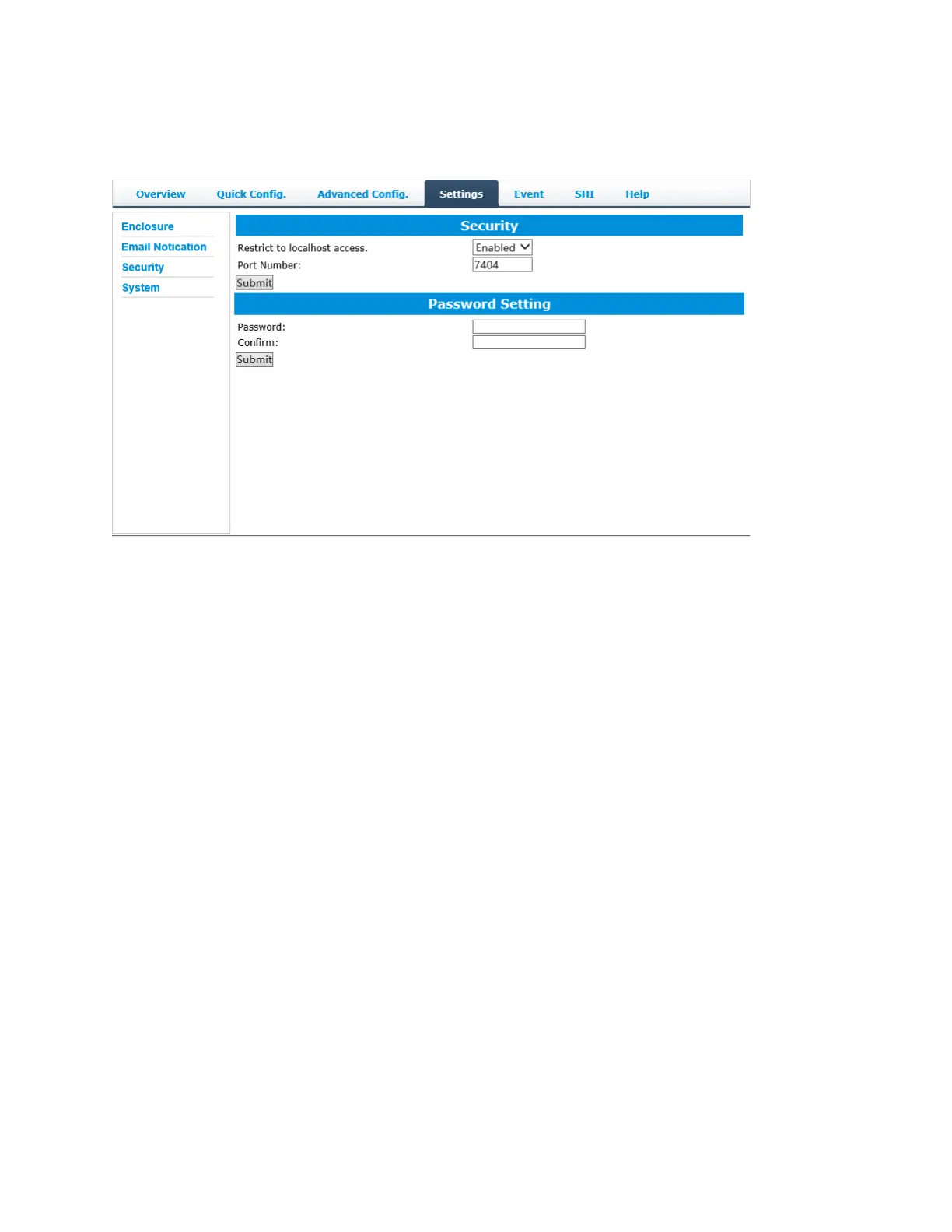 This section allows you to change the log-in password, Port Number and enable or disable localhost