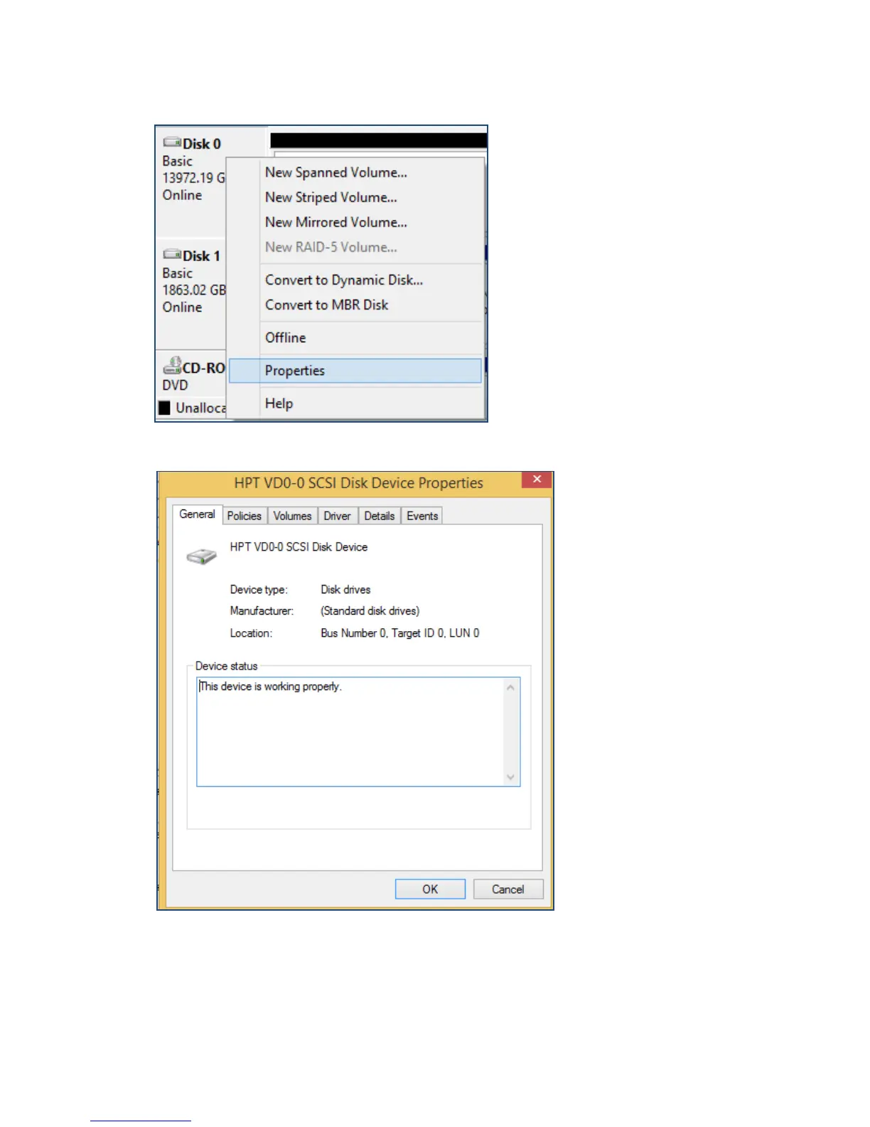 4. In properties, check and make sure it is a HPT VD (HighPoint Virtual Disk).