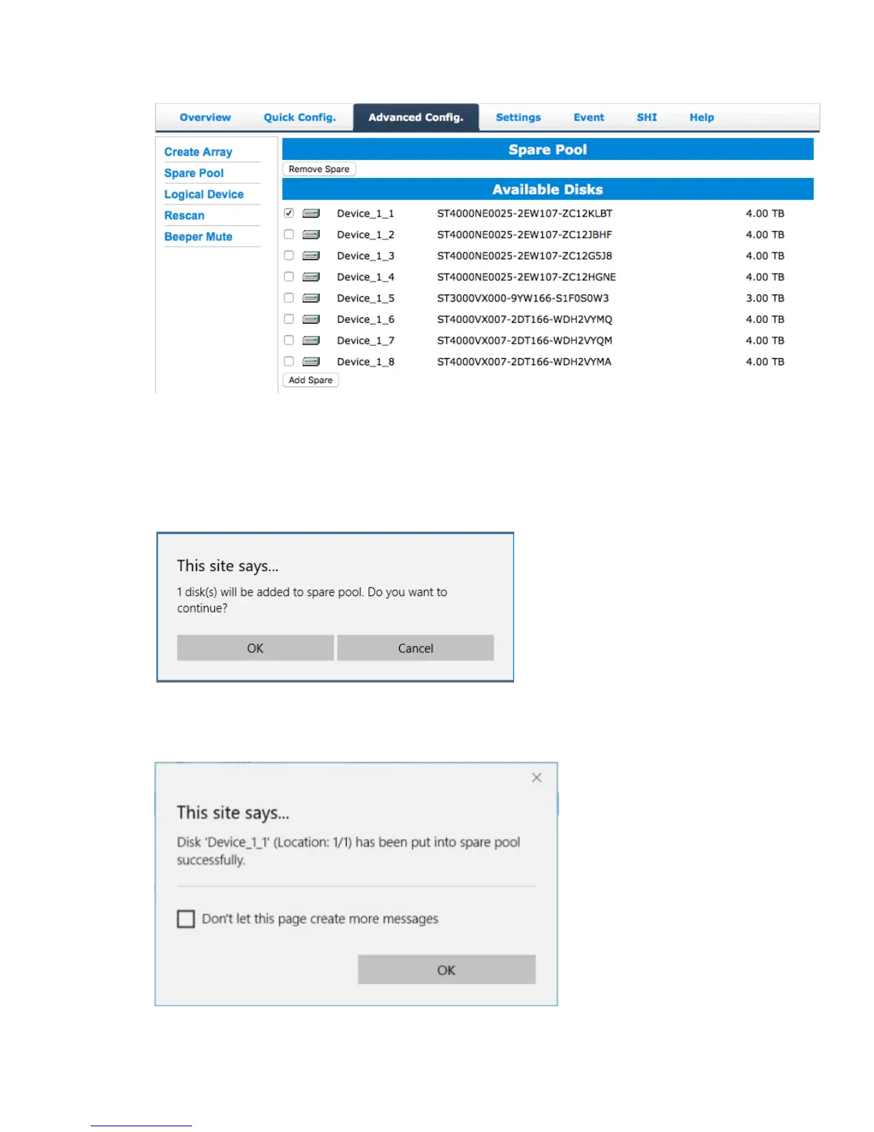 4. Click Add Spare, and confirm by selecting OK from the pop-up window: