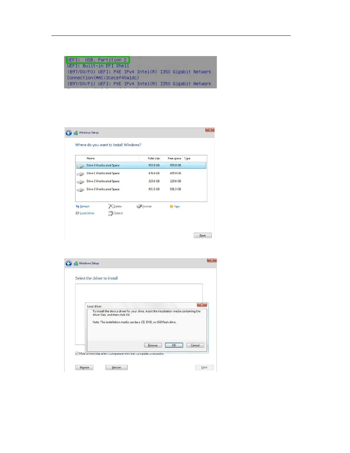 c. Install Windows, to “Where do you want to install Windows?”; Click “Load driver” ,