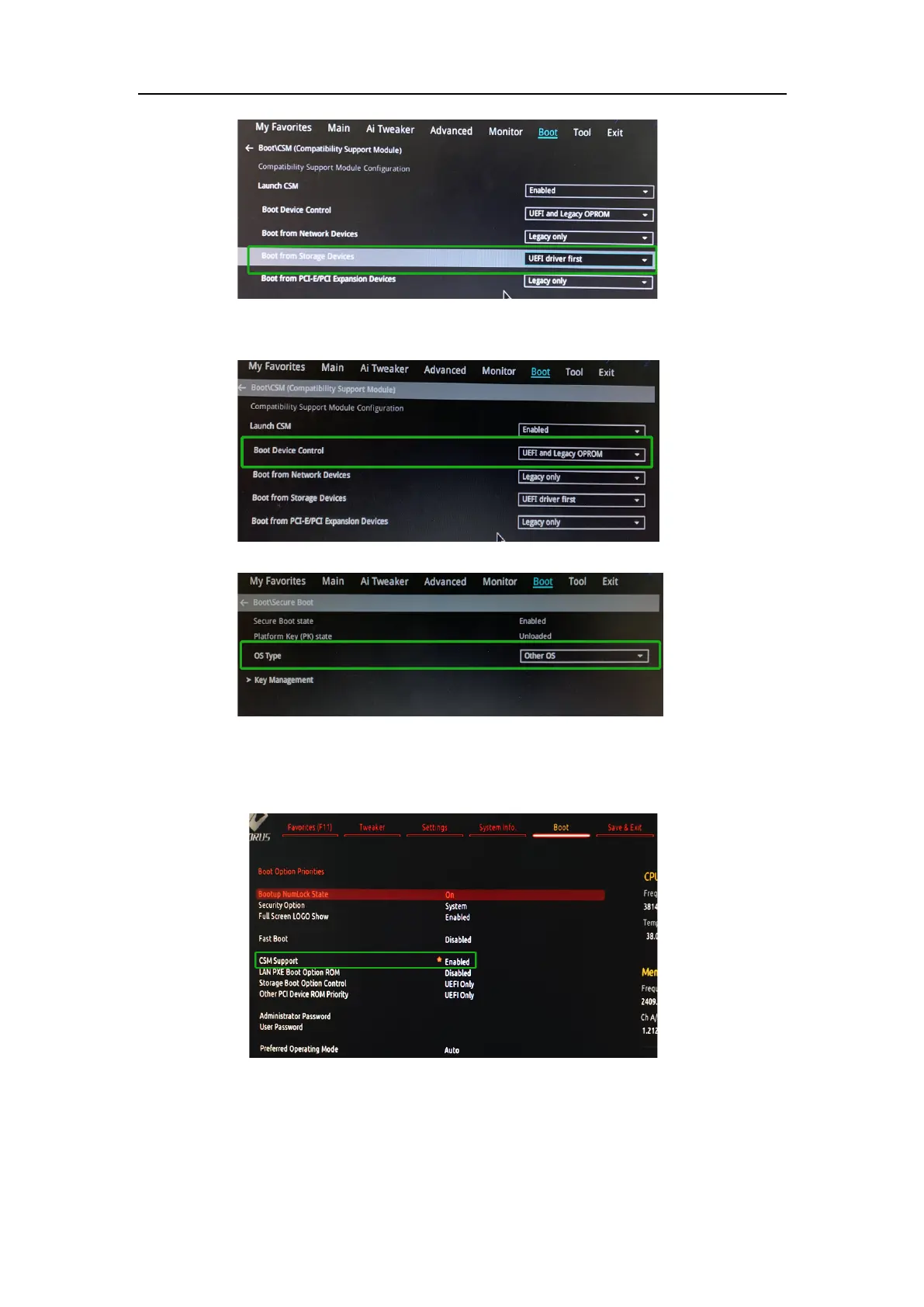 b. And " Boot->CSM->Boot Device Control" to "UEFI Only" or "UEFI and Legacy