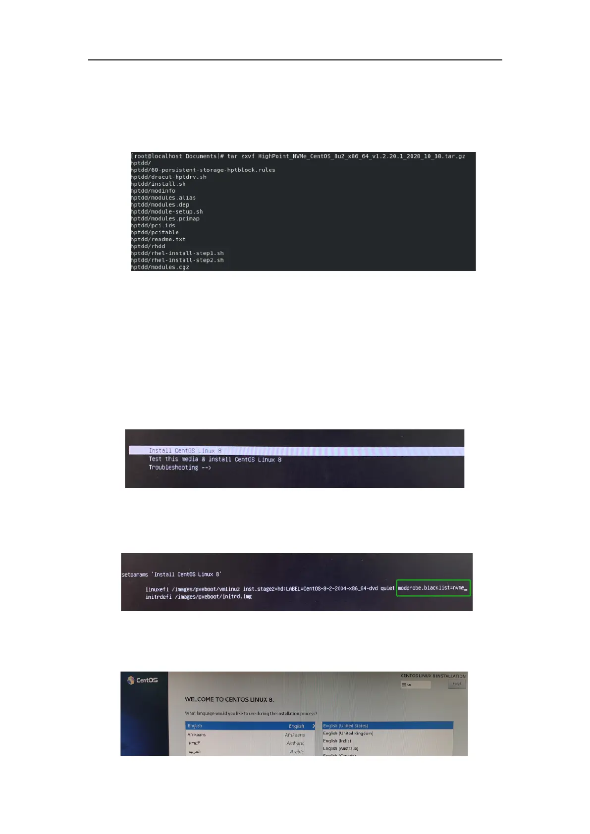a. Extract HighPoint_NVMe_CentOS_8u2_x86_64_ vx.x.x_xx_xx_xx.tar.gz to top(/)
