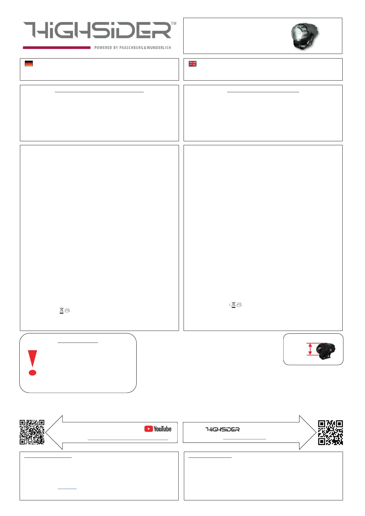 Scheinwerfers zu vermeiden. Bei Nichtbeachtung erlischt die Garantie!
