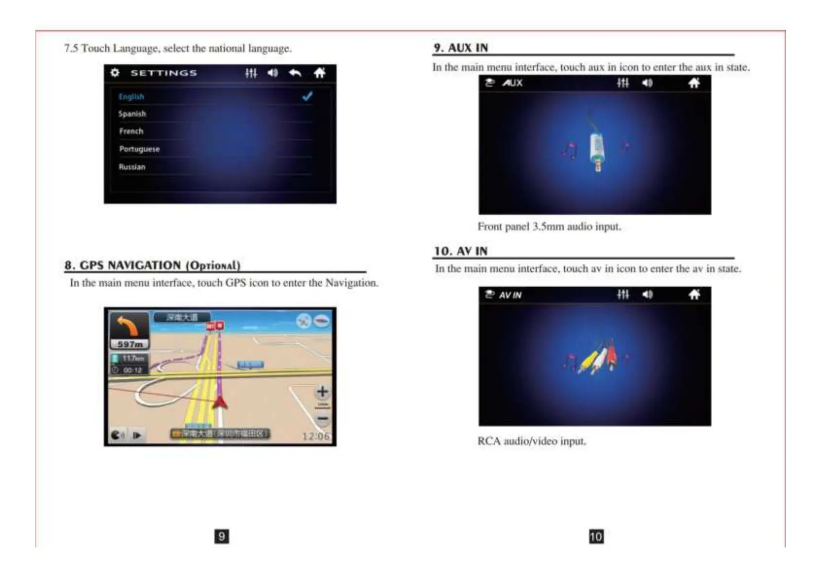 Hikity 9601 - SYSTEM SETUP FINAL; Language Selection; AUX IN CONNECTION; AV IN CONNECTION