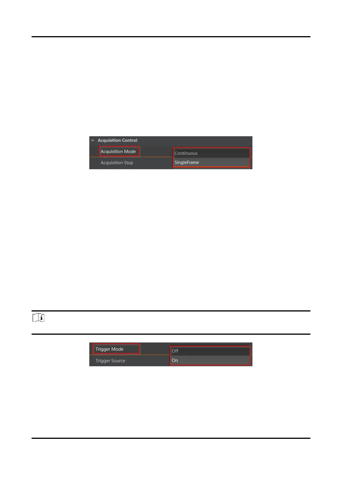 SingleFrame: When device starts image acquisition, it acquires one image only, and then