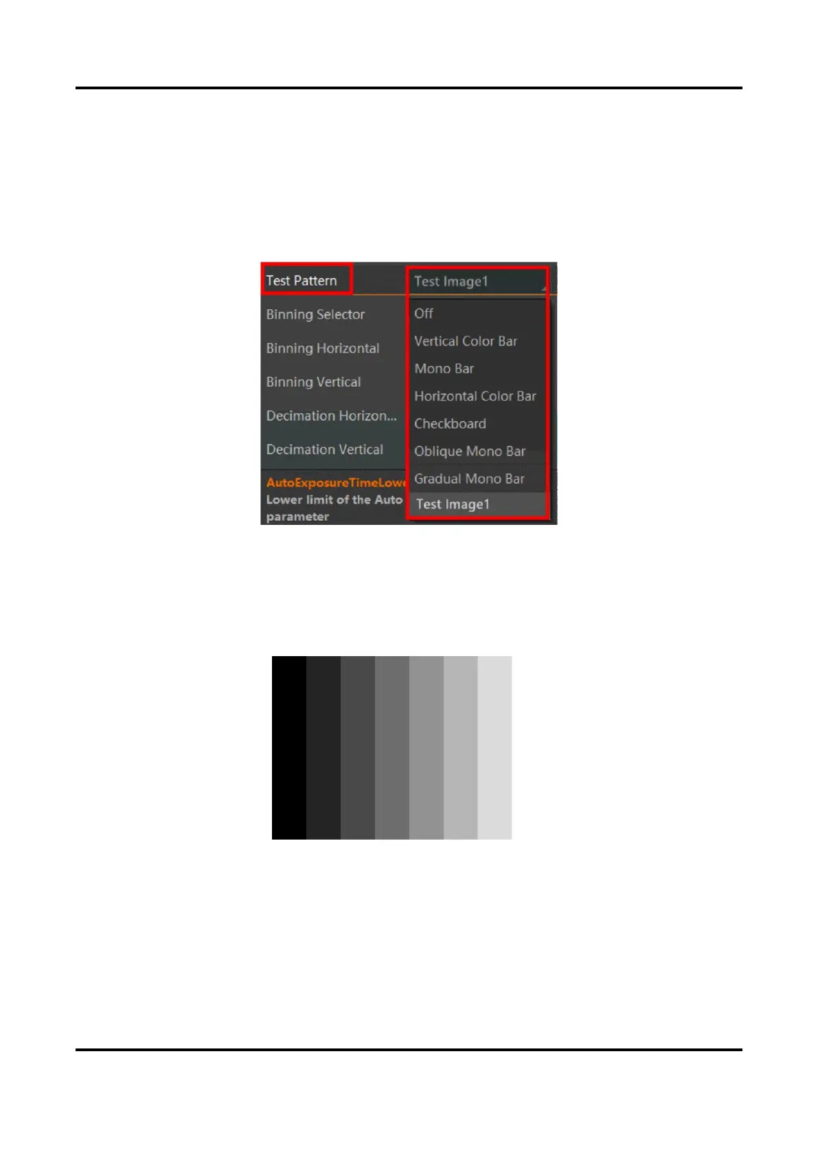 Go to Image Format Control → Test Pattern Generator Selector → Test Pattern, and set