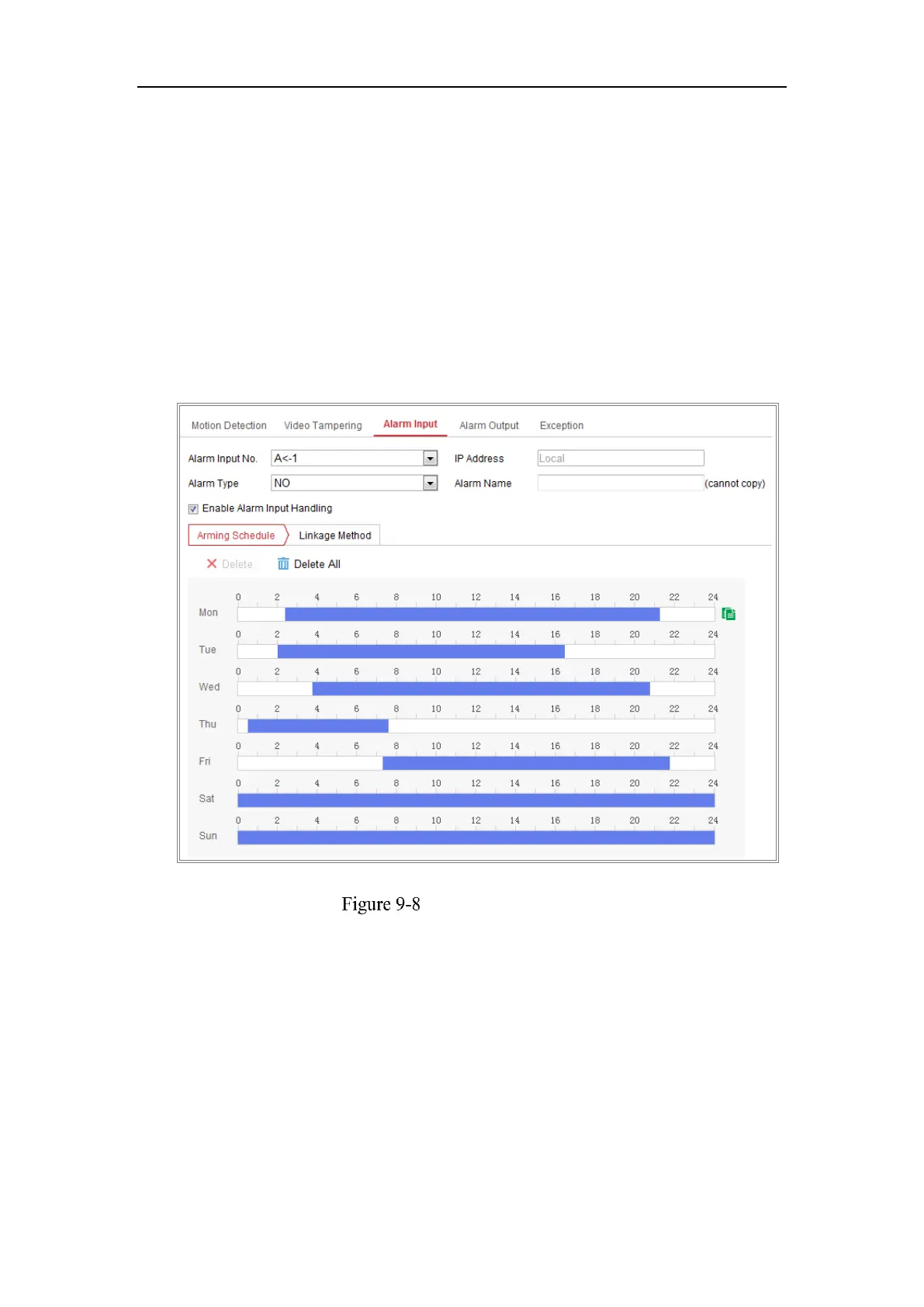 3. Click Arming Schedule to set the arming schedule for the alarm input. Refer to