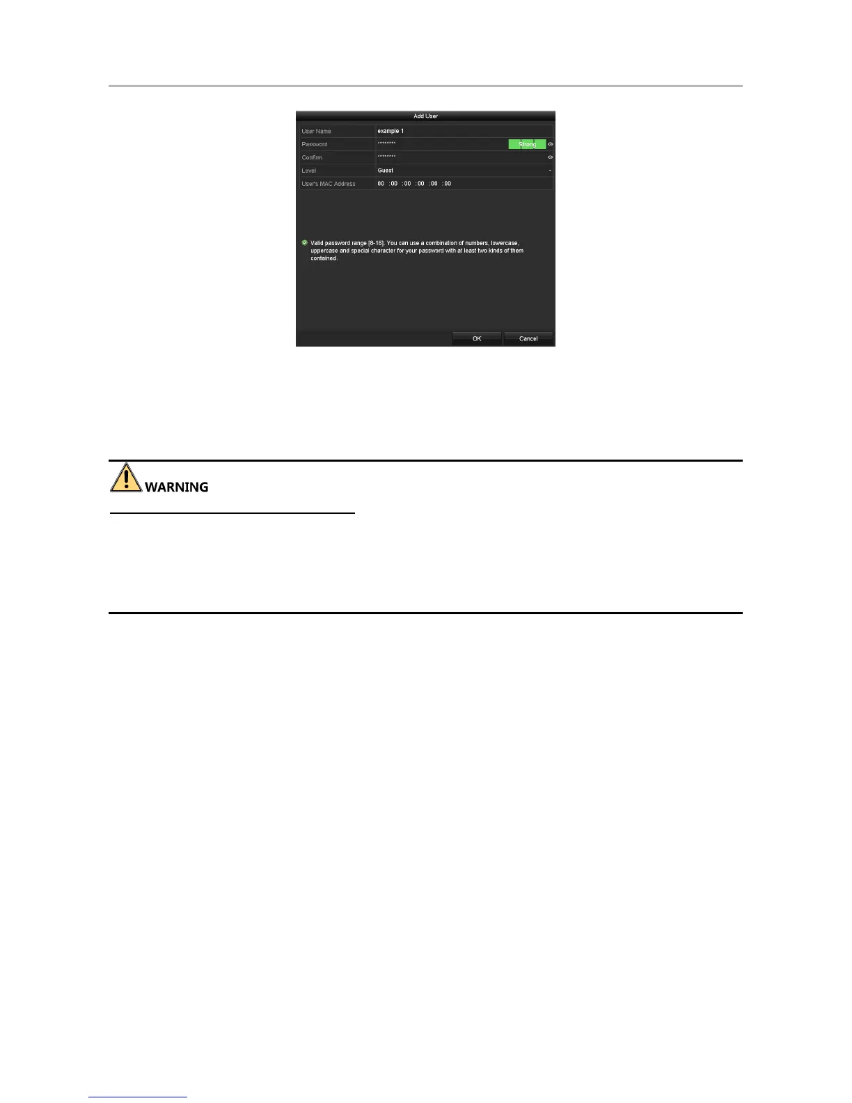 Step 3 Enter the information for new user, including User Name, Password, Confirm, Level and