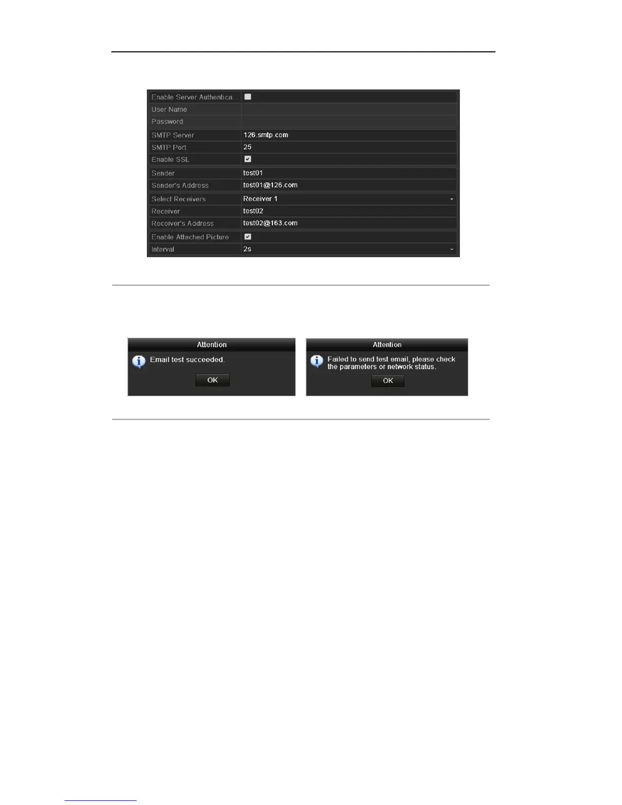 7. You can click the Test button to test whether your Email settings work. The corresponding Attention