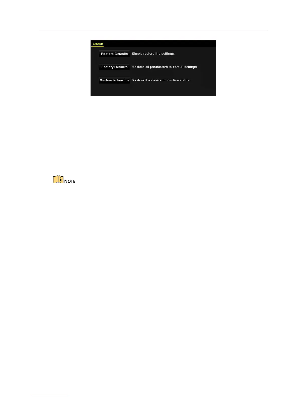 Restore Defaults: Restore all parameters, except the network (including IP address, subnet