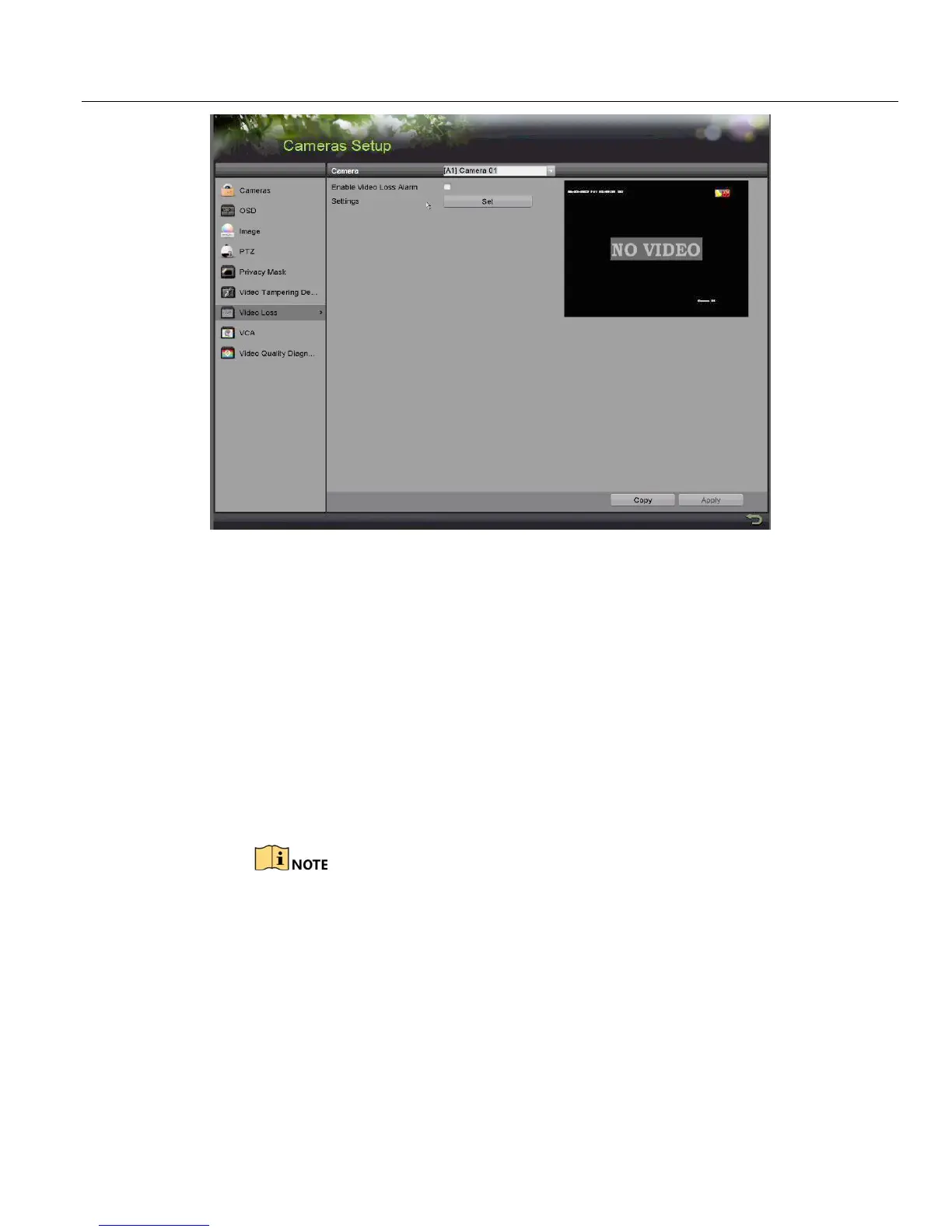 4. Check the Enable Video Loss Alarm checkbox.