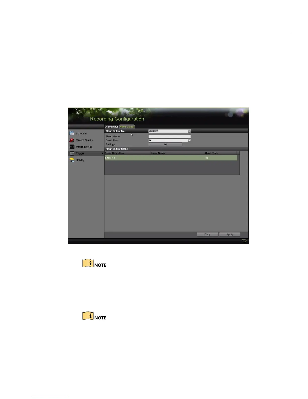 1. Enter the Alarm Output interface, Menu > Record Conf