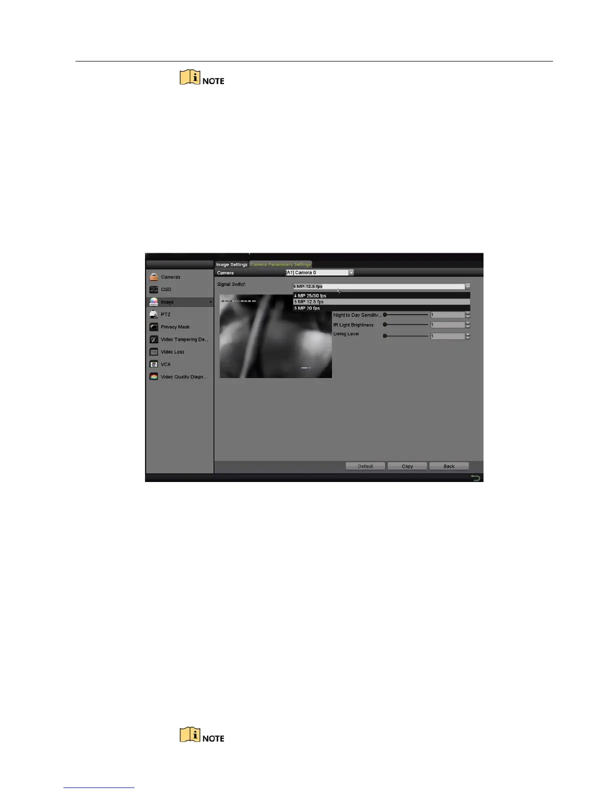 fps, 5 MP 12.5 fps, and 5 MP 20 fps are selectable. The 4 MP 25 fps and 4 MP 30 fps signals