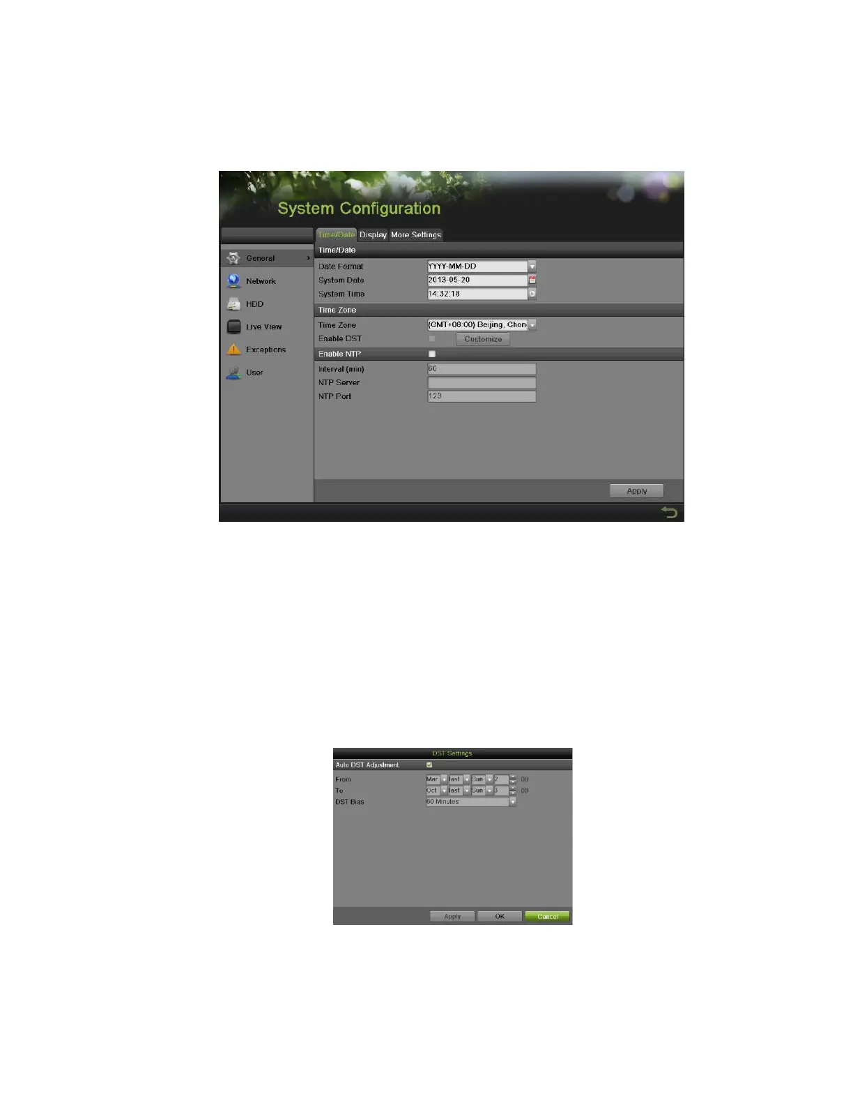 2) Check the Enable DST checkbox and click Customize button to pop up the DST Setting menu, as shown in Figure 38.