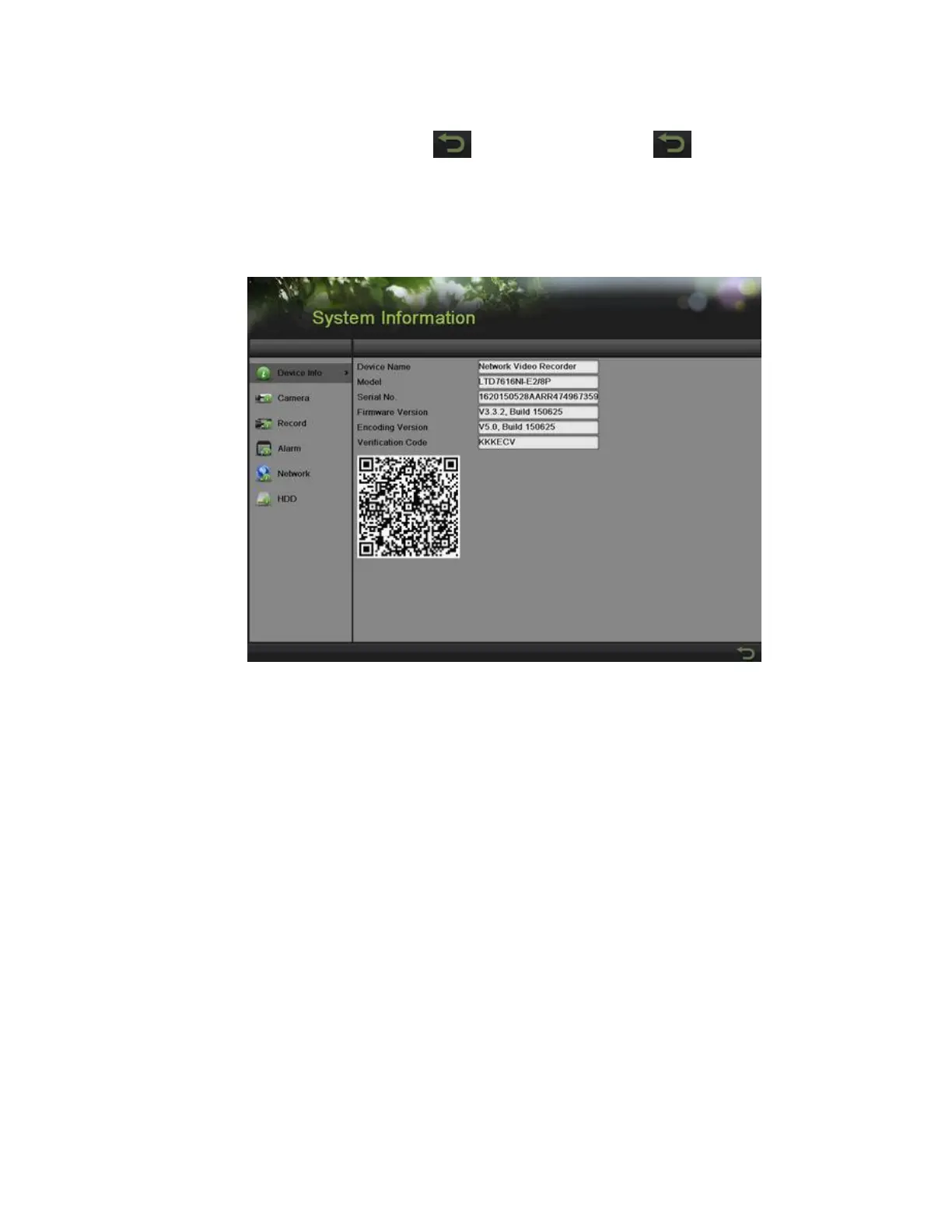 1. Select the Device Info tab to enter the Device Information menu to view the device name, model, serial No., firmware version, encode
