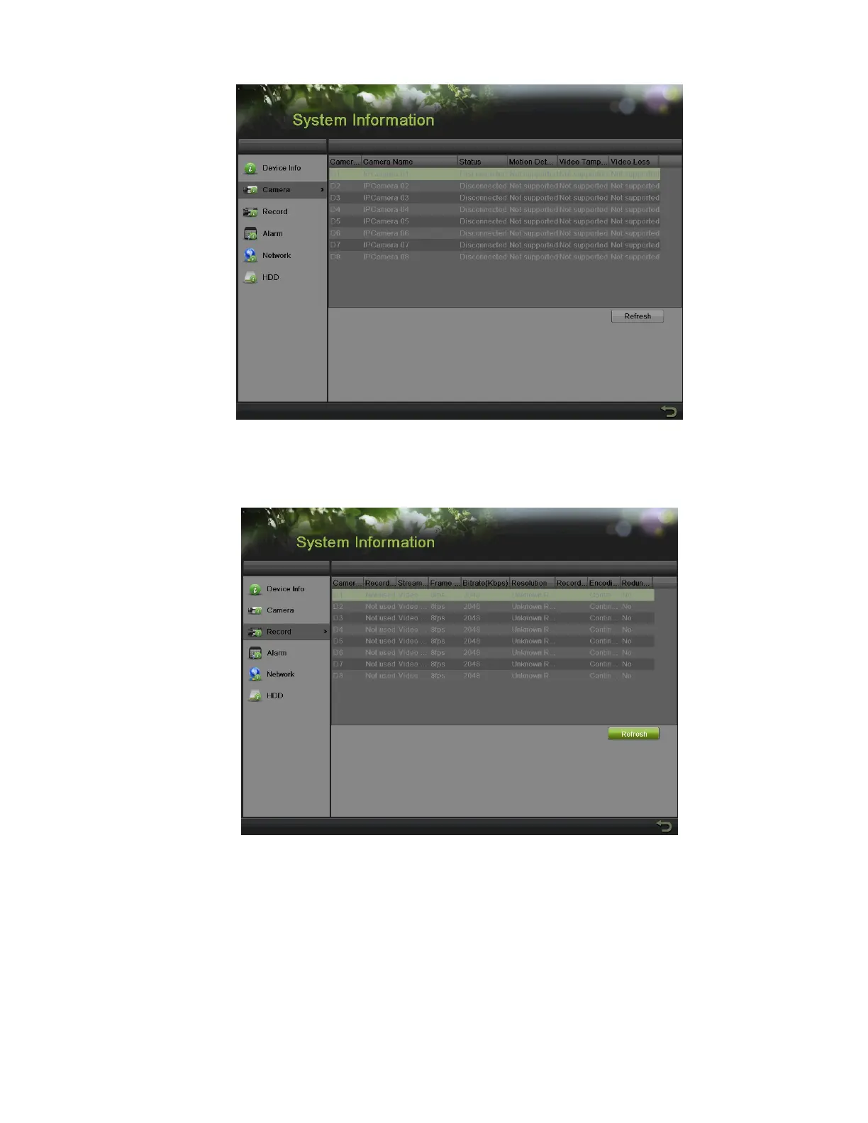 3. Select the Record tab to enter the Record Information menu to view the recording status and encoding parameters of each camera,