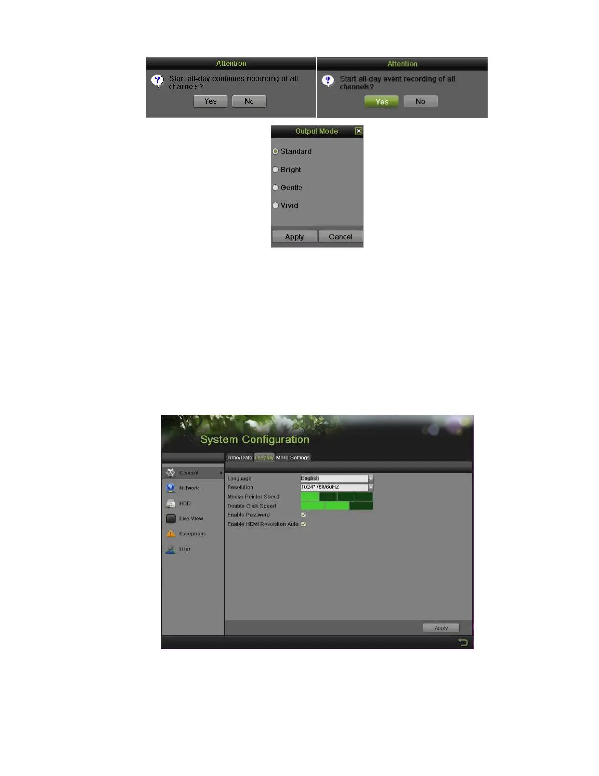 1. Set menu output resolution and mouse pointer speed by going to Menu > System Configuration > General > Display, as shown in