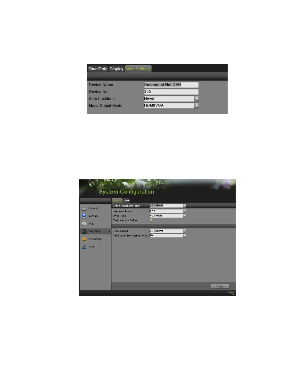 2. Set device name, device no. and auto lock time by going to Menu > System Configuration > General > More Settings, as shown in