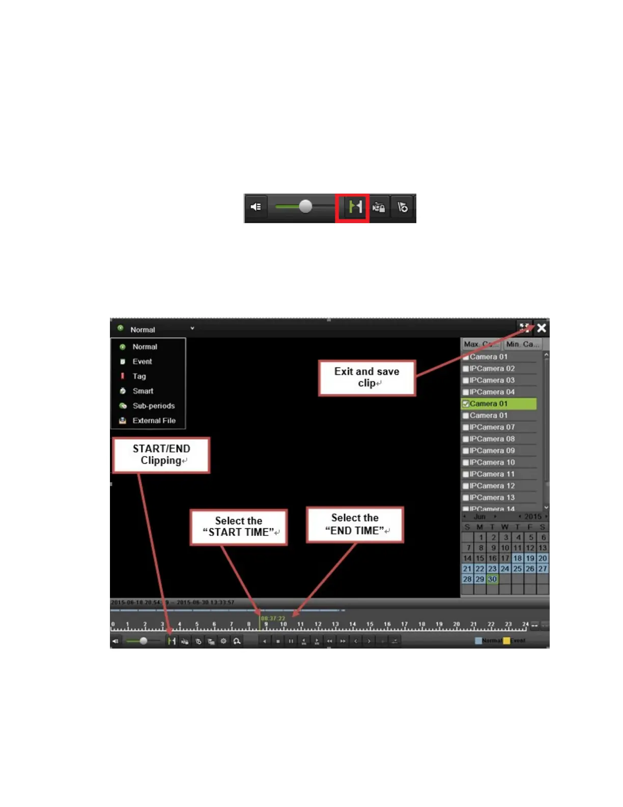 Video clips can be selected for backup in the Playback Interface using the controls found in the Mark Clip for Export panel, shown in