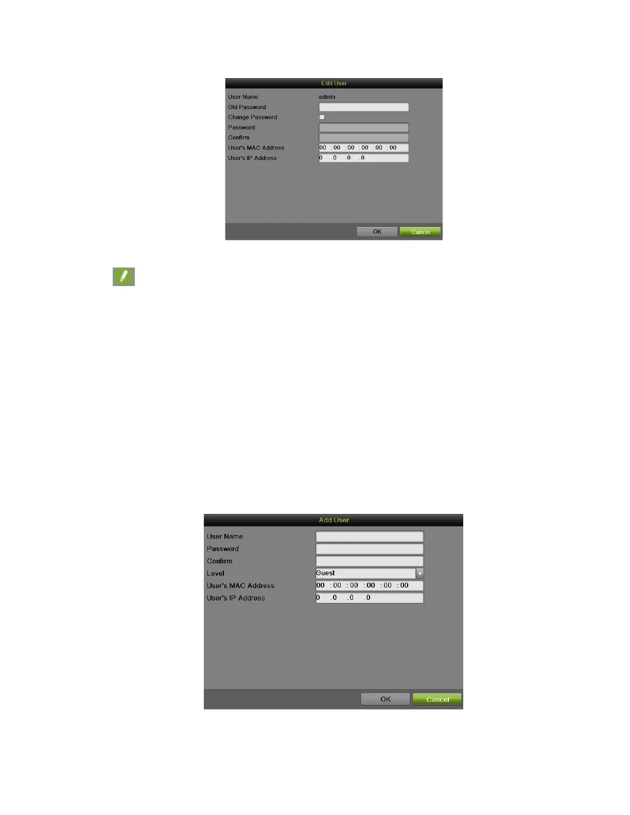 2. Enter the information for new user, including User Name, Password, Level and User’s MAC and IP Address. Set the user level to