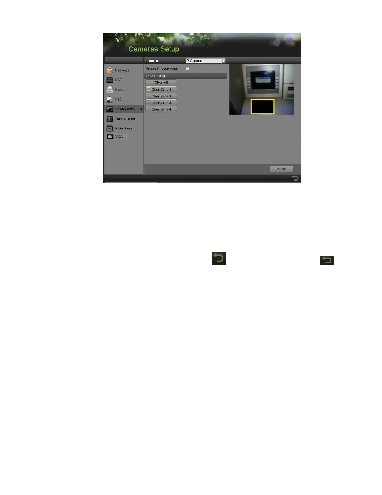 6. Select the Apply button to save the privacy mask settings and select to return to the previous menu. Selecting without