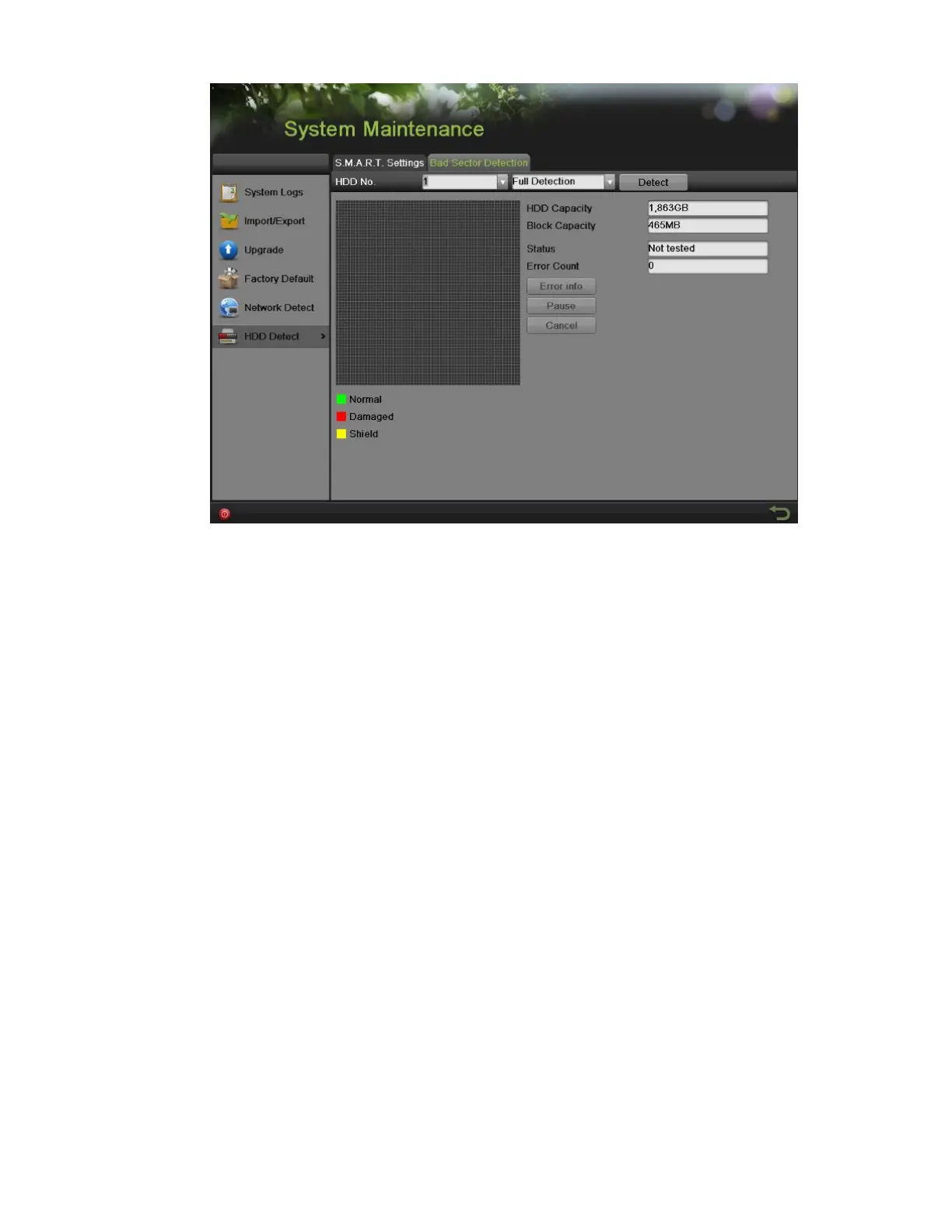 7. If the HDD is normal, you will see a green icon on the screen, while red means damaged and yellow means shield.