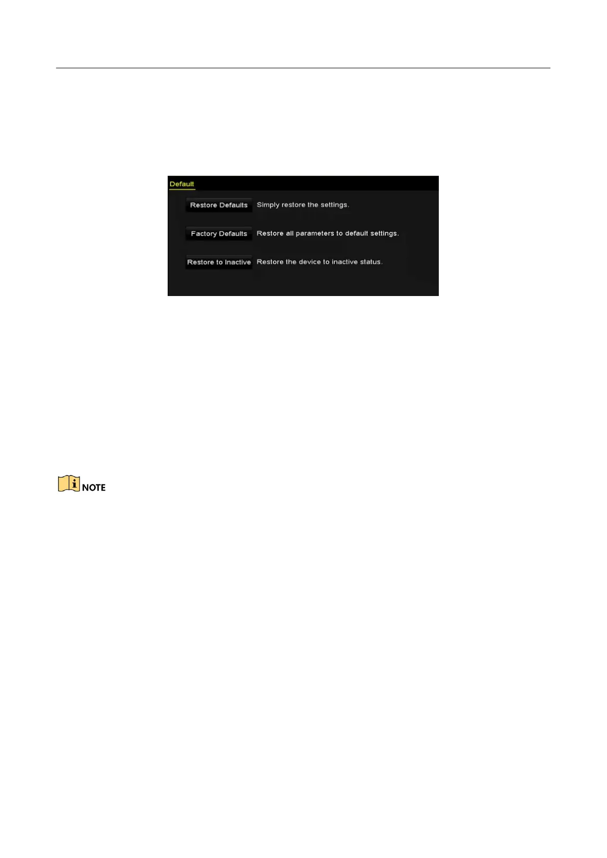 Restore Defaults: Restore all parameters, except the network (including IP address, subnet