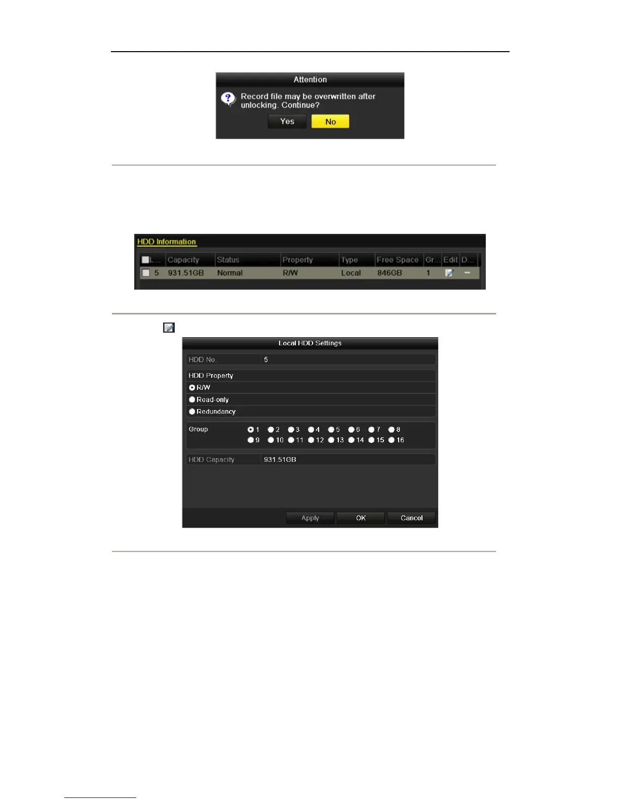 Note: To edit HDD property, you need to set the storage mode of the HDD to Group. See Chapter Managing