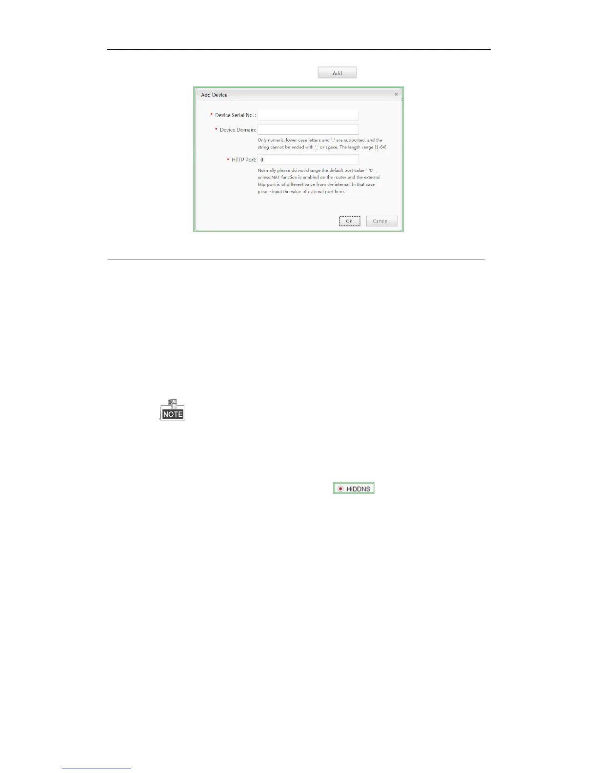 4) Input Device Serial No., Device Domain (Device Name) and HTTP Port. And click OK to
