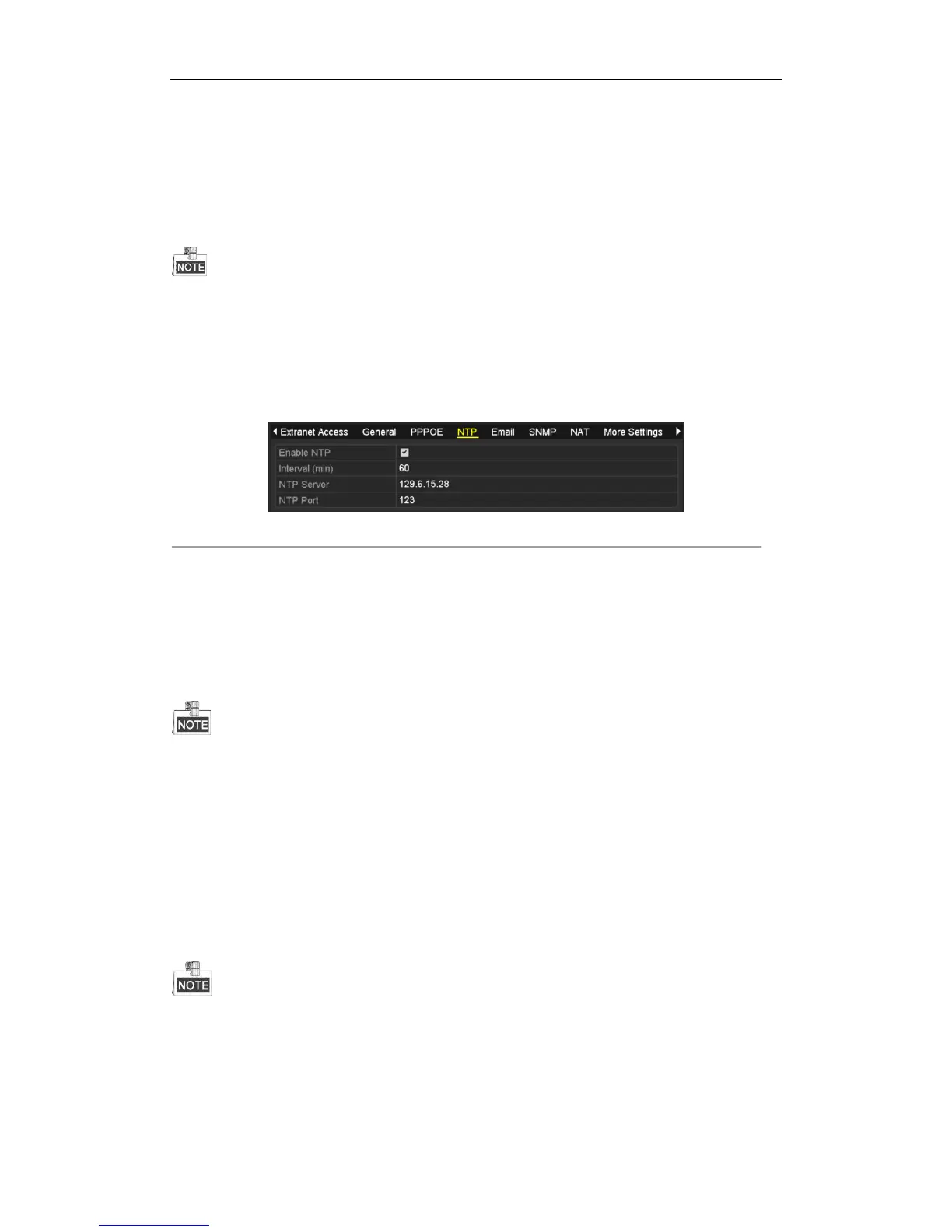 The time synchronization interval can be set from1 to 10080min, and the default value is 60min. If the NVR is