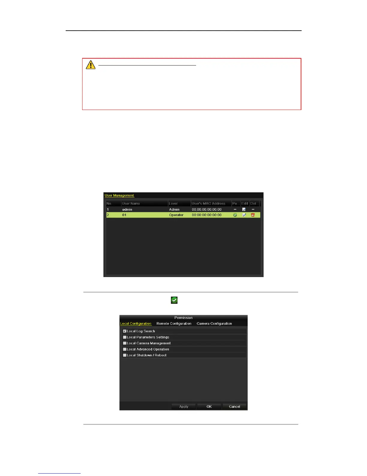 • Operator: The Operator user level has permission of Two-way Audio in Remote Configuration and all