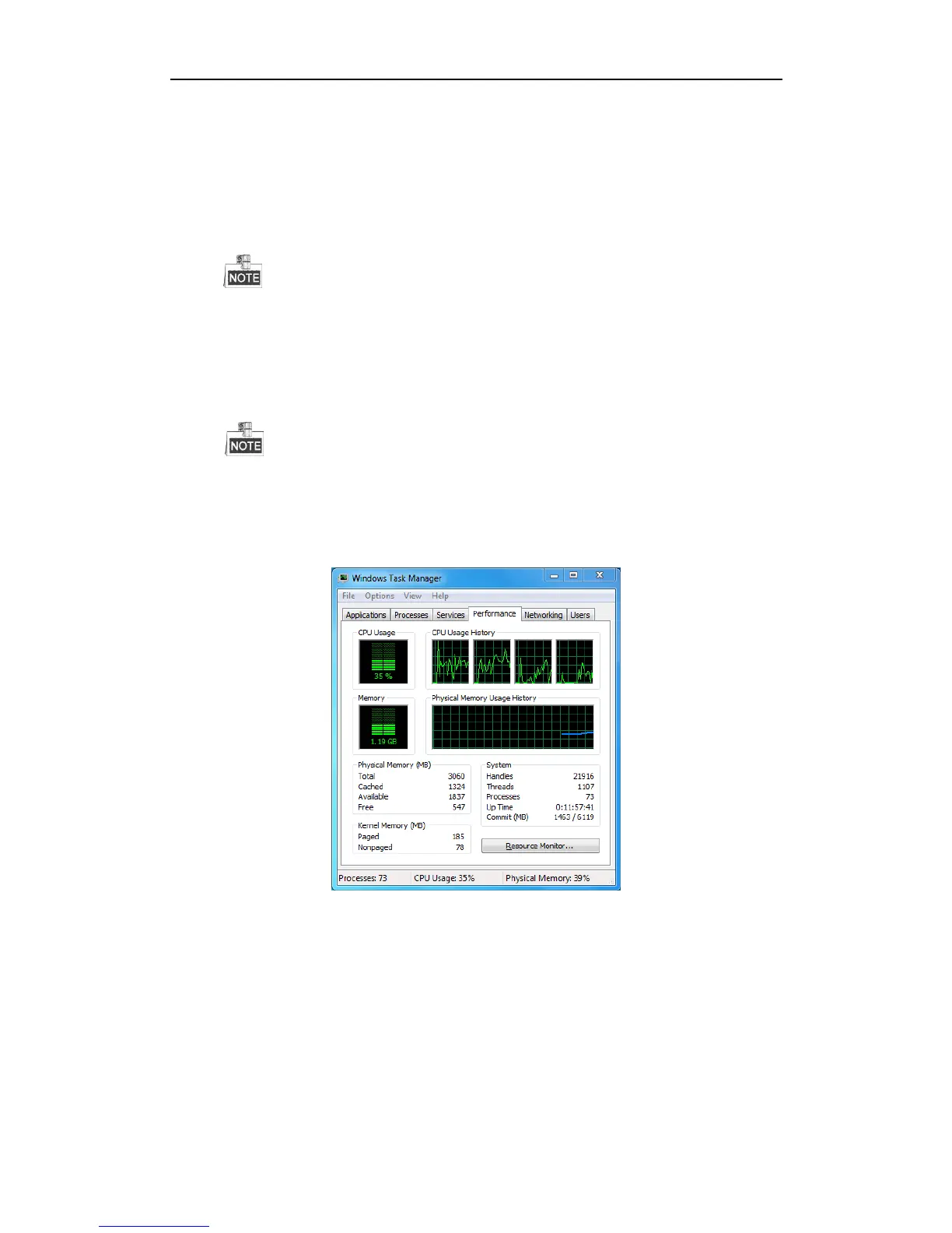 Select the “Performance” tab; check the status of the CPU and Memory.